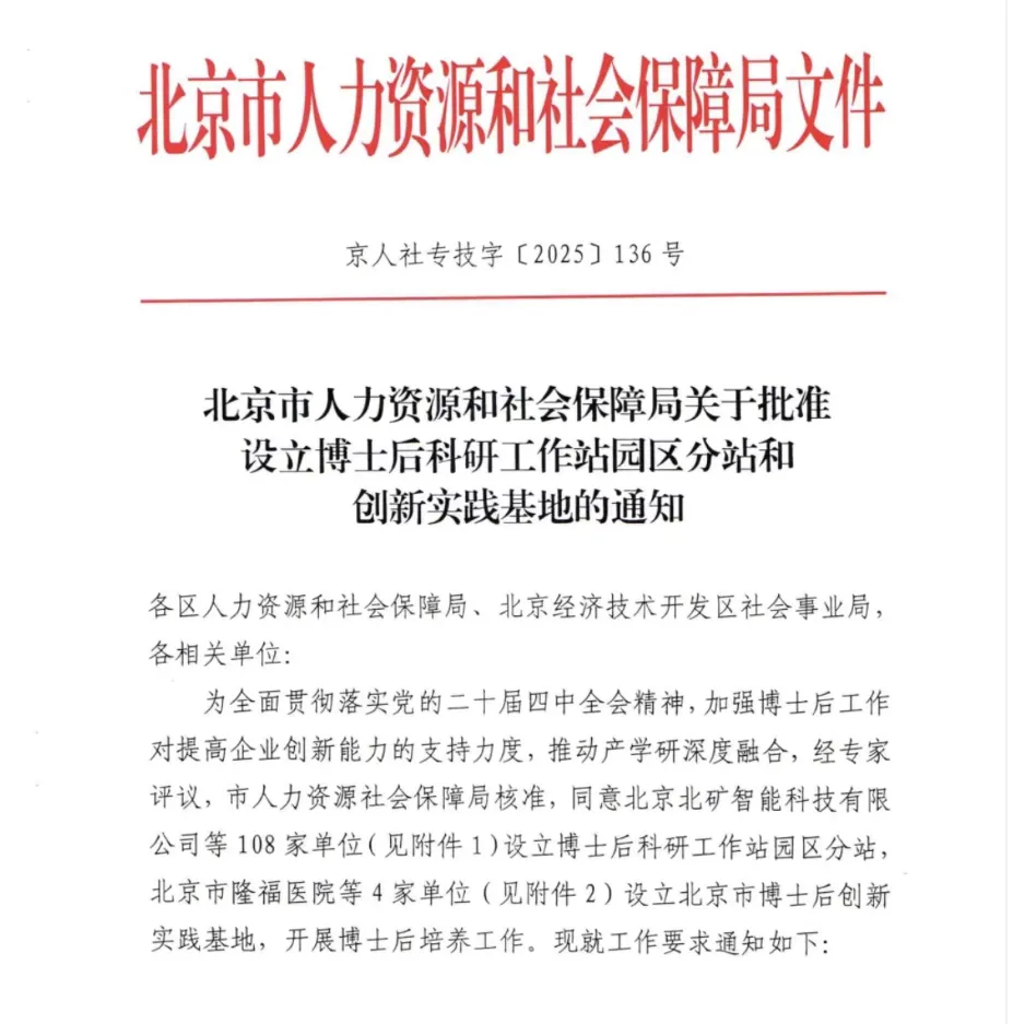 12月18日,北京市人力资源和社会保障局印发《北京市人力资源和社会保障局关于批准设立博士后科研工作站园区分站和创新实践基地的通知》(京人社专技字〔2025〕136号),华夏建龙成功获批设立北京市博士后科研工作站园区分站。这是继10月30日华夏建龙与北科大共建矿业研究院正式入驻后,公司在科研平台建设与高端人才引育领域的又一重要里程碑。 人力资源是第一资源,创新驱动的本质是人才驱动。博士后科研工作站是国家培养、吸引和使用高层次创新型青年人才的重要载体,此次成功获批,是对华夏建龙在矿业技术研发领域创新能力的充分肯定,标志着公司正式接入首都高水平博士后培养体系,为集聚、培养前沿科技人才搭建了至关重要的专业化平台。 “人才的整合能力”是苑占永董事长对公司人力资源建设的关键要求。未来,公司将依托博士后工作站,吸引、培育一批跨学科、复合型、创新型的青年科技领军人才,深化产学研用协同创新,推动人才战略与资源战略深度融合,加速前沿技术攻关与成果转化,为企业高质量发展提供强大的智慧支撑。