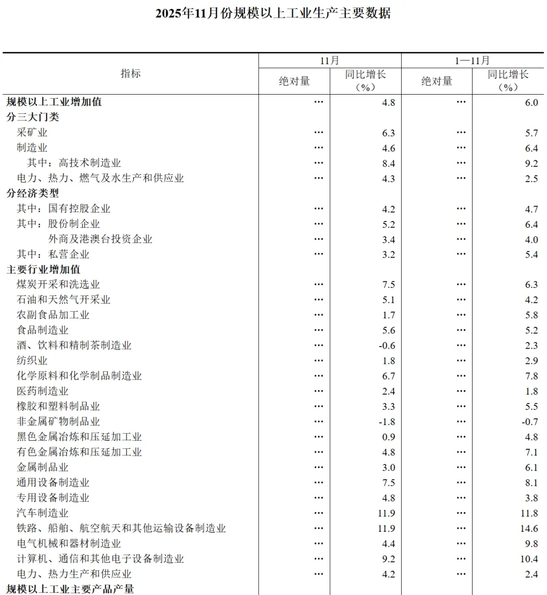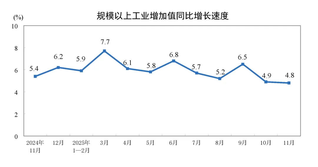 2025年11月份规模以上工业增加值增长4.8%