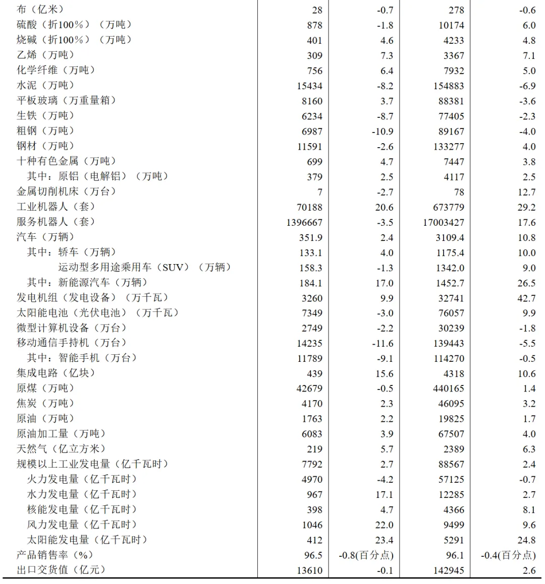 分产品看,11月份,规模以上工业623种产品中有310种产品产量同比增长。其中,钢材11591万吨,同比下降2.6%;水泥15434万吨,下降8.2%;十种有色金属699万吨,增长4.7%;乙烯309万吨,增长7.3%;汽车351.9万辆,增长2.4%,其中新能源汽车184.1万辆,增长17.0%;发电量7792亿千瓦时,增长2.7%;原油加工量6083万吨,增长3.9%。