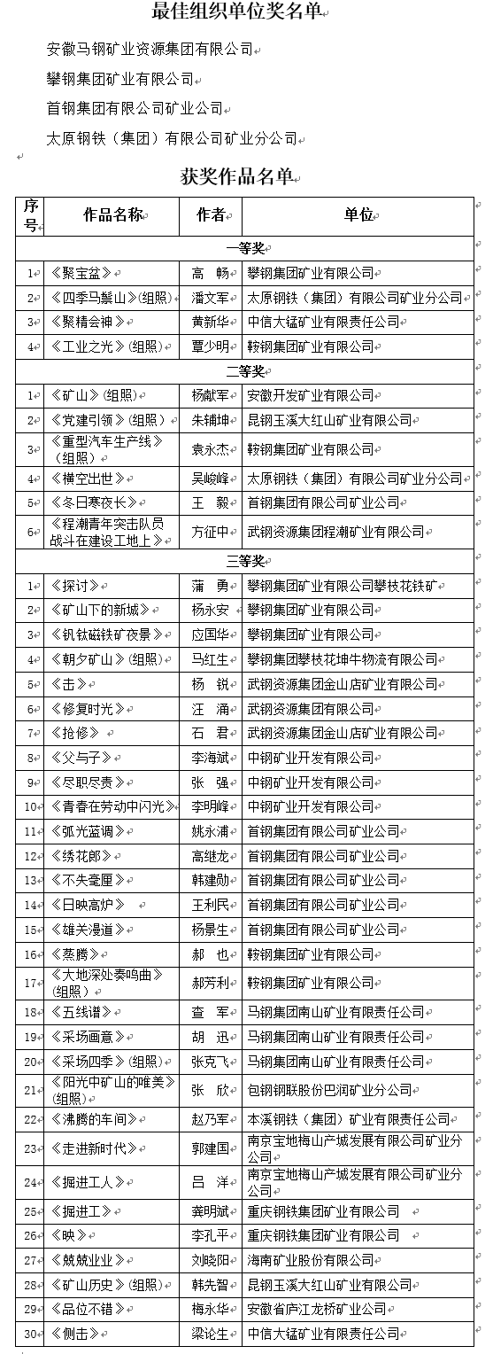 为确保摄影作品评审的公正性、权威性,组委会聘请《大众摄影》杂志主编、《中国摄影报》主编,以及摄影培训机构老师、大型企业专职摄影师等资深摄影专家和协办单位专家组成了7人评审组。经过专家初审形成意见、现场会再次评审的方式,最终评选出40件优秀作品,其中一等奖4名、二等奖6名、三等奖30名;经过组委会对各企业组织活动情况、职工参与情况、上报作品数量和摄影作品水平等方面进行综合分析,确定安徽马钢矿业资源集团有限公司等4个单位获得最佳组织单位奖(名单附后)。